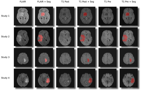 Prior to executing the preprocessing, a brain extraction was performed to ensure an anonymized data set and to clean the image from unneeded structures. Due to its state-of-the-art performance, the publicly available HD-BET artificial neural network-based algorithm was used [19]. To spatially align the different series of a study, the SimpleITK extension SimpleElastix was used to co-register the series of a study as part of the preprocessing pipeline. A rigid registration, which is a form of a linear transformation, was carried out for all images using the post-contrast series as a fixed reference. The fully automated segmentation of the tumor regions was carried out using DeepMedic trained on the BraTS 2019 dataset, a Convolutional Neural Network (CNN) based algorithm [18].