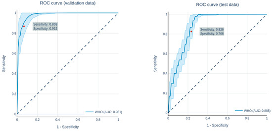 ROC curves of the prediction of the grading (LGG vs. HGG) in the validation data set (left) and the test data set (right).
