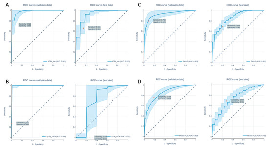 ROC curves of the prediction of the ATRX expression loss (A), the 1p19q co-deletion (B), the IDH1/IDH2 mutation (C) and the MGMT-status (D) in the validation data set (left) and the test data set (right).
