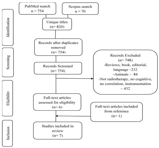 A total of 820 records were produced from PubMed and Scopus databases. After removing duplicates, 754 articles were reviewed for inclusion with screening on the title, abstract, and full text based on the PICOS criteria, and six met the inclusion criteria. At the second stage, 330 references and citations of the selected articles were reviewed, and one additional studies was selected. Only studies involving nasopharyngeal carcinoma (NPC) fulfilled the inclusion criteria though the study aimed to evaluate cognitive changes in head and neck cancer patients corresponding with the search term used for database search. A detailed flow chart on the article selection process is illustrated in Figure 1.