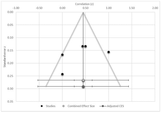 Trim and Fill was used to investigate potential publication bias for the meta-analysed studies [45]. The adjusted estimate is found close to the original—in this setting, a correlation of 0.45 and the observed correlation of 0.45. Visually, minor asymmetry (observed and imputed studies) was shown with no evidence of publication bias in Egger’s test (p = 0.48), thus, publication bias is not a significant concern. Rosenthal’s Failsafe—N is 61 and Orwin’s Failsafe—N is 71, suggesting a need for approximately 70 studies with a mean effect size of 0.5 added to the analysis before the cumulative effect would become statistically non-significant.