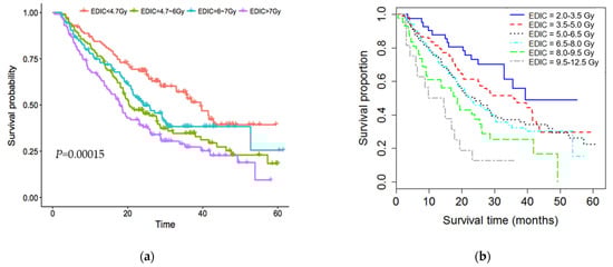 Overall survival curves separated by the effective dose to immune cells (EDIC). (a) for patients divided into 4 quartiles according to the EDIC); and (b) for patients divided into 6 EDIC groups with a 1.5 Gy dose increment. Survival improved significantly with a reduction in the EDIC. However, overall survival (OS) were not significantly different among patients with an EDIC between 6.0 and 8.0 Gy.