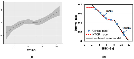 To further analyze the relationship between the EDIC and OS, 456 patients were divided into four groups with equal number of patients per the quartiles of the EDIC (Figure 1a), as well as into six groups with an equal dose increment of 1.5 Gy between two groups (Figure 1b). The Kaplan–Meier curves shown in Figure 1 depict a strong inverse relationship between OS and the EDIC (i.e., the greater the EDIC, the worse the OS). However, the relationship between the EDIC and OS was not strictly linear, because the survival estimates of some intermediate EDIC groups overlap in both Figure 1a,b. To further illustrate this non-linear relationship, we estimated the hazard of the EDIC by nonparametric smoothing using restricted cubic splines in a univariate Cox regression model of OS, stratified tumor dose (Figure 2a). This analysis showed that hazard rates increased with increasing EDIC when the EDIC was less than 6.0 Gy or larger than 8.0 Gy but not between 6 and 8 Gy. This Cox regression analysis showed that the risk of death increased by 23%/Gy (HR = 1.23, 95% CI:1.07–1.41; p = 0.003) with increasing EDIC when the EDIC < 6.0 and by 37%/Gy (HR = 1.37, 95% CI: 1.14–1.64; p = 0.0007) when the EDIC > 8 Gy. However, this curve was relatively flat for EDIC values in the range of 6.0–8.0 Gy.