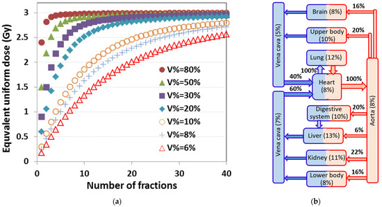 Computation of the EDIC model. (a) Equivalent uniform dose (EUD) to the total blood varies with fraction number (n) for various V% (the percentage blood volume irradiated in a specific organ during each fraction), which contains the B% of blood volume that receives irradiation with a mean organ dose (MOD). We have MOD ∗ B% = 3 Gy for this example organ. V% depends on the cardiac output A%, blood volume B%, blood circulation time T, and beam-on time t for each fraction and can be determined as V% = B% + (A% − B%) ∗ t/T. We note that when n > 20 and V% > 20%, EUD~MOD ∗ B%. Generally, EUD can be approximated as EUD~MOD ∗ B% ∗ k1 ∗ (n/45)1/2 for other organs with a smaller V%, where k1 is a dose effectiveness factor. (b) Major organs in the blood circulation system and their estimated percentage cardiac output (A%) and percentage blood volume (B%) based on an anatomy/physiology text book. For thoracic irradiation, 4 organs/components, including lung, heart, great vessels, and small vessels/capillaries in other organs, contribute to the total blood dose. Because A% ≥ 40% for lung, heart and great vessels, and with t~1 min and T~1 min, we have V% = A% ≥ 40%, and the contribution of dose to the blood for these organs can be estimated to be EUD~MOD ∗ B%.