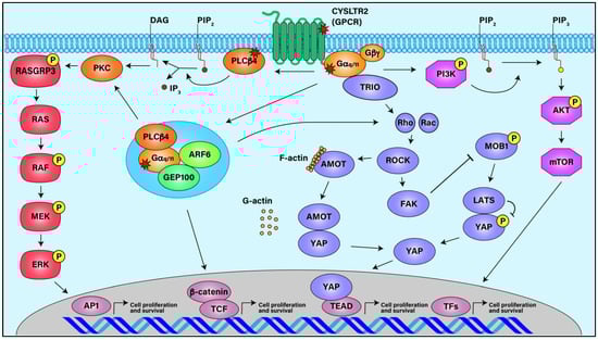 Signaling Pathways in Uveal Melanoma. Activating mutations in GPCR CysLTR2, Gαq/11, and PLCβ4 stimulate downstream signaling pathways such as ARF6, MAPK, FAK/YAP, and AKT/MTOR, all of which can lead to UM cell proliferation and survival.