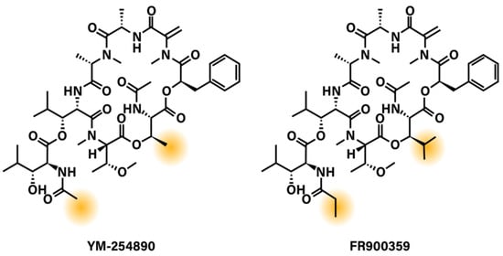 Chemical structures of Gq/11 depsipeptide inhibitors YM-254890 and FR900359. Highlighted areas show the regions of YM-254890 and FR900359 that differ.