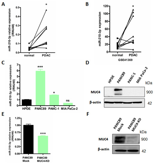 MiR-210-3p is overexpressed in PDAC tissues and pancreatic cancer cell lines compared to normal pancreas. (A) RT–qPCR analysis of miR-210-3p relative expression level in nine paired human pancreatic cancers and their corresponding non-tumoral adjacent tissues. Expression levels are evaluated using 2−ΔCt method (ΔCt = Ct miR-210—Ct RNU48). (B) Analysis of miR-210-3p expression level in GSE41369 PDAC dataset using GEO2R analyzer. (C–E) RT–qPCR analysis of miR-210-3p relative expression in PANC89, PANC-1 and MIA PaCa-2 pancreatic cancer cells, HPDE normal human pancreatic ductal cells (C) and PANC89 Mock and MUC4-KD cells (E). Expressions were determined according to the 2−ΔΔCt method (ΔΔCt = (Ct miR-210—Ct RNU48)—Ct HPDE). Three independent experiments were performed. (D–F) Western blotting analysis of MUC4 and β-actin expression in PANC89, PANC-1, MIA PaCa-2, HPDE (D) and Mock and MUC4-KD PANC89 cells (F). * p < 0.05 and *** p < 0.001 indicate statistical significance compared to normal tissues. ns indicates no statistical significance. At least three independent experiments were conducted.