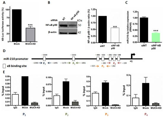 We previously demonstrated MUC4 involvement in transcriptional gene regulation via NF-κB pathway modulation [9]. In this study, we investigated whether miR-210-3p expression level was also subject to this MUC4 regulatory mechanism via the NF-κB signaling pathway. We first confirmed the MUC4 impact on NF-κB pathway activity in PANC89. Indeed, we showed that MUC4-KD in PANC89 cells induce a 57.4 ± 9.9% significant decrease in relative luciferase activity of the kB-Luc synthetic promoter compared to Mock cells (p < 0.0001, Figure 3A). We then performed transient NF-κB knock-down in PANC89 cells and validated NF-κB p50 siRNA efficacy by Western blot analysis showing a strong decrease in p50 NF-κB subunit expression (41%, p < 0.001, Figure 3B). We observed a significant decrease in miR-210-3p expression level in PANC89 p50 NF-κB knock-down cells compared to non-targeting (NT) siRNA control cells (62.7 ± 3.0% decrease, p < 0.0001, Figure 3C). Using the Eukaryotic Promoter Database (https://epd.epfl.ch//index.php, accessed on 8 January 2019), we analyzed the miR-210 promoter and identified numerous κB putative binding sites in silico. We then investigated p50 NF-κB subunit direct binding on the miR-210 promoter following chromatin immunoprecipitation experiments. We observed a p50 NF-κB binding enrichment compared to IgG negative control on four miR-210 promoter regions (P1–P4), encompassing seven different κB p50 binding sites tested in PANC89 cells (Figure 3D,E). Interestingly, we observed that these NF-κB p50-miR-210 promoter interactions were lost in PANC89 MUC4-KD cells.