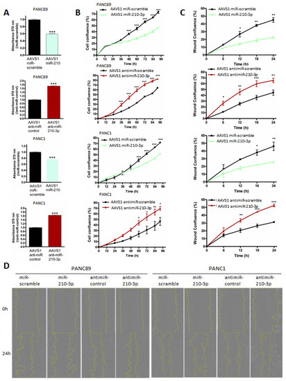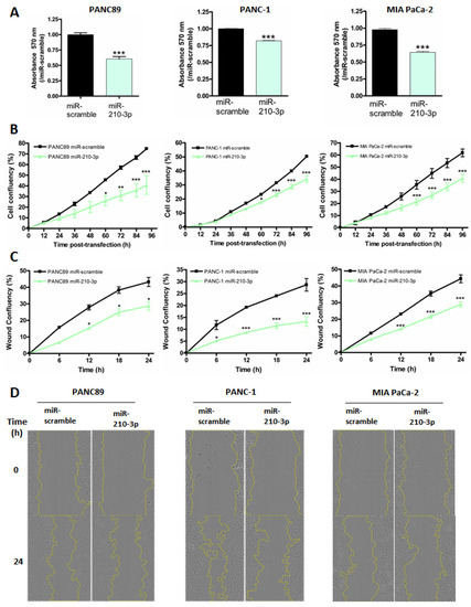 Transient expression of miR-210-3p inhibits proliferation and migration of pancreatic cancer cells. (A) PANC89, PANC-1 and MIA PaCa-2 cells were transiently transfected with miR-210-3p or miR-scramble for 96 h. Cell viability was assessed using MTT assays. MiR-scramble condition was arbitrarily set to 1. Three independent experiments were performed. (B) Cell confluency was evaluated using the Incucyte™ apparatus over 96 h following miR-210-3p or miR-scramble transient transfection of PANC89, PANC-1 and MIA PaCa-2 cells. Three independent experiments were performed. (C) Wound-healing assays were performed in transient transfected miR-210-3p or miR-scramble cells. Wound area was measured every 6 h for 24 h using an Incucyte™ instrument. Experiments were performed in triplicate. * p < 0.05, ** p < 0.01 and *** p < 0.001 indicate statistical significance compared to miR-scramble. Three independent experiments were performed. (D) Representative images of wound healing in PANC89, PANC-1 and MIA PaCa-2 cells.