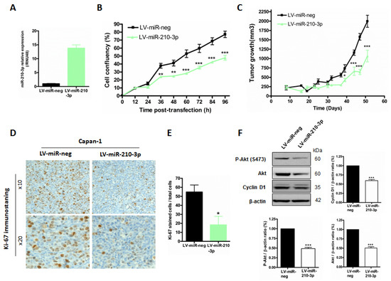In order to investigate miR-210-3p’s in vivo functions, we used Capan-1 PDAC cells that were previously transfected with a lentivirus encoding miR-210-3p (LV-miR-210-3p and LV-miR-neg control cells). First, we validated a strongest miR-210-3p overexpression using RTqPCR analysis (13.8 ± 1.2-fold change, p < 0.001, Figure 7A). We confirmed the in vitro miR-210-3p anti-proliferation effect in Capan-1 LV-miR-210-3p compared to LV-miR-neg cells (38.1% decrease, p < 0.001) (Figure 7B) as previously demonstrated in Figure 5 and Figure 6. These cells were then subcutaneously xenografted in SCID mice and tumor growth was evaluated for 51 days. We observed that LV-miR-210-3p Capan-1 tumors were significantly smaller than LV-miR-neg control tumors (42% decrease, p < 0.05) at 39 days and the difference was sustained until mice were euthanized (Figure 7C). Tumors were extracted and Ki67 index was analyzed by immuno-staining (Figure 7D,E). We observed a statistically significant decrease in the Ki-67+ cell percentage in tumors from LV-miR-210-3p (66.6 ± 18.9 decrease, p = 0.0245) compared to miR-neg control tumors. Moreover, Western blot analysis of Capan-1 LV-miR-210-3p cells showed a decrease in proliferation-associated protein levels, such as S474 phospho-Akt, constitutive Akt and Cyclin D1 compared to Capan-1 LV-miR-neg control cells (Figure 7F and Figure S4).