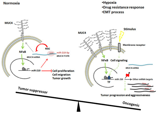 Schematic representation of overall miR-210-3p tumor suppressor/oncogenic effects in PDAC cells. Left: MUC4-miR-210-3p negative feedback loop that we identified under normoxic conditions. Right: Hypothetical model of miR-210-3p regulation and roles under hypoxia, drug resistance or metastasis signaling. Green arrows represent activating signals. Red arrows represent inhibitor signals. Short red line represents miR-210-3p. RISC: RNA-induced silencing complex. TF: transcription factors.