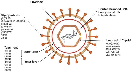 As with all herpesvirus, KSHV is a large double-stranded DNA virus of approximately 165 to 170 kilo bp associated with a typical herpesvirus icosahedral capsid composed of four structural proteins (MCP (major capsid protein), TRI-1, TRI-2 (triplex component 1 and 2), SCIP (small capsomer-interacting protein) and CSAF (scaffolding or assembly protein)) [13,14] that is not a part of the capsid but is essential for its assembly. The capsid is surrounded by a tegument, defined as an electron dense material, and composed of an inner and external layers associated with the following eight proteins encoded by the ORF: 11, 21, 33, 45, 52, 63, 64 and 75 [15,16]. They may contribute to the early events of viral replication as well as the entry of the genome during the primary infection. Finally, the tegument is surrounded by an envelope deriving from the nucleus membrane (lipid bilayer) of a KSHV-infected cell [17]. Eight glycoproteins are incorporated in this layer (gB, K8.1A, K8.1B, gH, gL, gM, gN) and involved in the interaction with host cells [14,15,18,19,20,21]. KSHV’s viral particle size is about 110 to 150 nm in diameter (Figure 1).