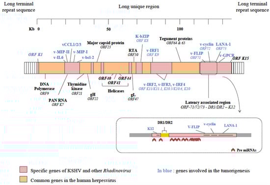 KSHV’s genome was firstly sequenced from the PEL cell line, BC-1 [5]. The central long unique region (LUR), about 137 kilo bp in length, is flanked with highly GC-rich 801 pb long terminal repeat sequences [5]. The LUR includes the 90 open reading frames (ORFs) and the 13 pre microRNA (miRNA) encoding for 25 miRNAs. Most of the ORFs are common in the human herpesvirus (from ORF4 to ORF75) [14], whereas fifteen are specific to the Rhadinovirus (K1 to K15) (Figure 2). Several of these ORFs encode numerous proteins involved in lytic and latent infection programs. The viral genes encoded by KSHV also include cellular homologous genes that may be included in the common or specific genes (for example, v-IL-6 (viral interleukin 6), v-BCL-2, v-FLIP (viral Fas-associated protein with death domain-like interleukin-1β-converting enzyme/caspase-8-inhibitory protein), v-Cyclin) [22]. Furthermore, consistent with its transforming potential, KSHV encodes numerous proteins with proliferative, antiapoptotic, angiogenic, immuno-evasion properties and inflammation [23]. More recently, KSHV has been found to generate circular RNAs (circRNAs) from several KSHV genes, most abundantly from K10 (vIRF4, viral interferon regulatory factor 4), K7.3 and polyadenylated nuclear (PAN) RNA. All the KSHV circRNAs are incorporated into KSHV virions and are potentially expressed as immediate early products in newly infected cells [24].