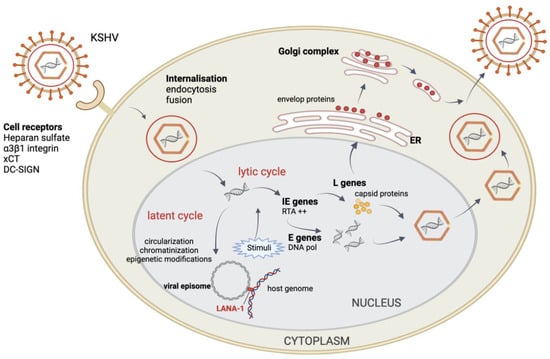 KSHV is able to reactivate and enter in the replicative phase under the influence of various protein stimuli (ex: PKC, ERK) and physiological (ex: hypoxia, oxidative stress, reactive oxygen species, etc.) [43,44] or chemical substances such as TPA (tetradecanoyl phorbol myristyl acetate) and n-butyrate [45]. This replicative phase leads to the lysis of the infected cells and the production of new infectious viral particles. Similar to the other herpesviruses, KSHV expresses genes following a temporal and sequential expression pattern divided in the following three phases: immediate–early (IE), early (E) and late (L). The IE genes encode transactivators of the E and L genes, including, in particular, the ORF-50 encoding the RTA protein, the leader for the initiation of the lytic phase [46,47]. To do so, the RTA protein associates with the cellular transcription factor RBP-Jk in order to activate its own promoter and, thus, maintains itself at a sufficient level for perpetuating the lytic cycle [48,49]. Other genes, such as ORF K8 and ORF57, are also expressed concomitantly with ORF50. More recently, PAN RNA, a non-coding viral RNA encoded by ORF-K7, has also been reported to play a role in viral reactivation by sequestering the LANA-1 protein, and thus lifting its inhibition on lytic gene expression [50,51]. After the IE phase, the E genes expressed an encoded viral protein primarily required for DNA replication and gene expression, in particular, among others, the viral DNA polymerase (ORF9) involved in the replication of the viral genome, the viral thymidine kinase (ORF21) and the viral phosphotransferase (ORF36, homologue of the UL97 protein kinase encoded by human cytomegalovirus), bZIP, vIRF-1 (viral interferon regulatory factor), v-IL-6, v-CCLs (viral-encoded chemokines) and v-GPCR (viral G-protein coupled receptor) [52]. Finally, about 24 h after the initiation of the lytic phase, the L genes encoding structural and maturation proteins of the viral particles are expressed. Once all of the three phases have been achieved, the assembly of the new viral particle begins in the nucleus. The KSHV genome is incorporated into the newly synthesized capsids in the nucleus, then acquires teguments in the cytoplasm and, buds through host membranes to obtain envelopes. Finally, the viral progeny are released from the host cell [48] (Figure 3).
