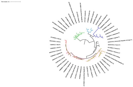 For now, the diversity of KSHV is mainly related to the origin of the patients; subtypes A and C are found worldwide and particularly in North America, Western Europe, the Mediterranean basin and Asia [112,113,114]. The variant A5, on the contrary, was first, and is mainly, reported in Africa, as is the subtype B [115,116]. The subtype D is described in the Pacific Island and Taiwan [117]; the subtype E is in Native Americans in Brazil [118,119]; the subtype F is in a few individuals in Uganda (variant F1) [120] and, more recently, in Caucasian MSM living in France (variant F2) [121]; finally, the subtype Z is described in a small cohort of children in Zambia [122] (Figure 4).