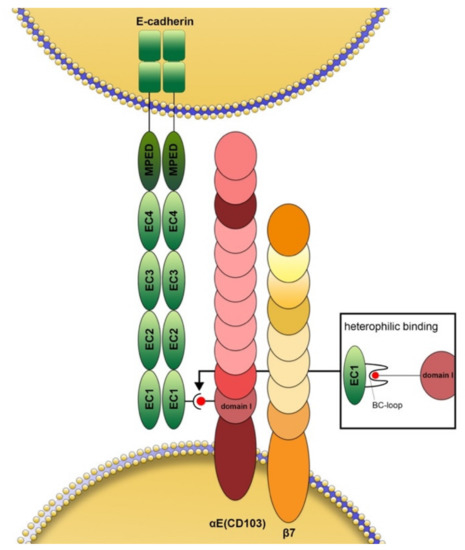 The integrin αE chain (CD103 in the strict sense) dimerizes exclusively with the β7 integrin subunit (Figure 1) while the latter can also pair with α4, resulting in the α4(CD49d) β7 receptor (lymphocyte Peyer’s patch adhesion molecule) [21,22]. Scientific interest in CD103 increased after it was discovered that it is the first integrin to bind to a cadherin, namely E-cadherin [3,4,23,24]. The αE-subunit binds through its metal ion-dependent coordination site (MIDAS) motif in domain 1 to the tip of the BC-loop within the EC1 domain of E-cadherin [23,24,25,26] (Figure 1). The best-known function of E-cadherin is certainly homophilic binding to identical E-cadherin molecules [27], although there is also (circumstantial) evidence for binding to other cadherins [28]. In the case of CD103, however, the binding is heterophilic. The β7 chain does not bind directly to E-cadherin but appears to have more of a regulatory function in this process [27]. Experimental evidence suggests that in some cases, for example in keratinocytes and endothelial cells, CD103 can also bind to other ligands that have not been identified until now [29,30]. In some cell types, cadherin26 (CDH26) has been suggested as a possible additional ligand [31]. Binding through CD103 allows immunocytes to maintain close contact with both peripheral lymphoid and non-lymphoid tissue, e.g., in the lung, skin, gastrointestinal, and genitourinary tracts [25].