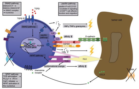 In addition, TGFβ directly increases the affinity of CD103 for E-cadherin through phosphorylation of integrin-linked kinase (ILK) [51]. T cell receptor (TCR) signaling is stimulated via the nuclear factor of activated T cells (NFAT) pathway phospholipase C (PLC) γ1, inositol trisphosphate (IP3), and, depending on calcium and calcineurin, the phosphorylation of NFAT. The latter contributes to the transcription of the ITGAE gene and the production of CD103 mRNA [52]. Moreover, TGFβ and TCR activation together lead to “inside-out”-signaling of CD103 [35,36]. In parallel, the stimulation of both TCR and chemokine receptors prompts conformational changes in CD103 and thus an increased affinity to E-cadherin [53,54,55]. In turn, CD103 leads to activation of the paxillin pathway through close interaction with its ligand, E-cadherin. The binding of paxillin to the cytoplasmic domain of CD103 facilitates the migration and effector functions of cytotoxic T cells. This results in cytokine secretion (interferon (IFN)-γ, tumor necrosis factor (TNF), T cell intracellular antigen (TIA)-1, granzyme), re-localization of cytotoxic granules and their release (under TCR co-stimulation), as well as TCR-mediated cytotoxicity and, eventually, the demise of the target cell (Figure 2) [56].