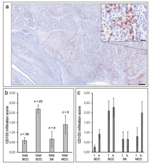 Only very recently, the first investigation on CD103 in infiltrating cells of cutaneous squamous cell carcinomas (cSCC) was published. This elegant study showed that cutaneous squamous cell carcinomas have a rather variable number of tumor-infiltrating CD103+CD8+ cells. These cells expressed more IL-10, PD-1 and CTLA-4 compared to CD103-negative cells. Moreover, the number of CD8+CD103+ cells seemed to correlate with a rather unfavorable clinical course, which seems to contrast quite strikingly with findings in solid tumors of several other organs [79]. However, CD103 distribution in other epithelial skin tumors such as basal cell carcinomas or benign neoplasms is unknown. In addition, data on the spatial distribution of CD103-expressing cells in epithelial tumors (epithelial tumor fraction vs. tumor stroma) including cSCC are not available.