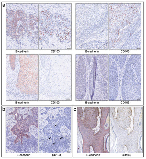 The expression of CD103 in epithelial skin tumors has hardly been studied. This is surprising since (i) basal cell carcinomas (BCC) [91,92,93] and cutaneous squamous cell carcinomas (cSCC) [94,95,96] are by far the most common tumors of (especially fair-skinned) humans, (ii) these tumors are usually immunogenic [97,98,99], (iii) they often respond to topical and/or systemic immune modulation [100,101,102,103,104], and (iv) their incidence increases greatly upon immunosuppression [105,106]. Moreover, it was already described more than a quarter of a century ago that malignant T cells of cutaneous T cell lymphomas with high CD103 expression migrate preferentially into the E-cadherin-bearing epidermis [107,108].