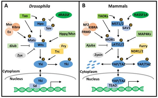 The Hippo pathway in Drosophila and Mammals. (A) The Drosophila Hippo pathway. The core kinase cascade of the Drosophila Hippo pathway consists of Hpo, Sav, Wts, Mats, and Yki. When the Hippo pathway is activated, Yki is phosphorylated and sequestered in the cytoplasm. Otherwise, Yki localizes to the nucleus and binds Sd to stimulate gene transcription. Many elements are involved in the direct interaction with the core components to regulate the Drosophila Hippo pathway, including Tao, dRASSF, Kibra–Ex–Mer complex, Hppy/Msn, dJub, Zyx, and Fry–Trc complex. (B) The mammalian Hippo pathway. The core of the mammalian Hippo pathway is comprised of MST1/2, SAV1, LATS1/2, MOB1, and YAP/TAZ. When the mammalian Hippo pathway is on, YAP/TAZ are phosphorylated and are either retained in the cytosol or targeted for degradation. When the mammalian Hippo pathway is off, YAP/TAZ translocate to the nucleus to activate TEAD for gene transcription. The extended elements in the mammalian Hippo pathway include TAOKs, RASSF1A, KIBRA–FRMD–NF2 complex, MAP4Ks, Ajuba, Zyxin, and Furry-NDR1/2 complex.