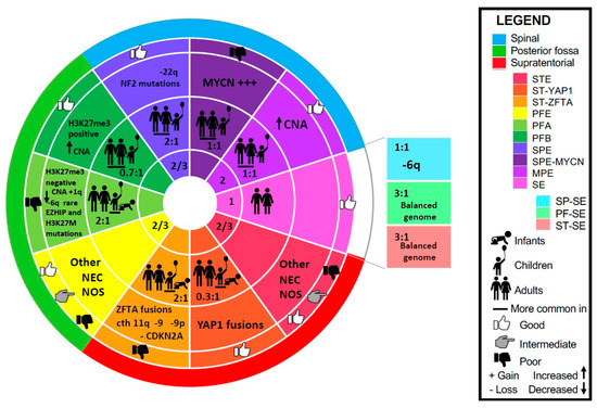 Ependymoma molecular classification per WHO 2021. Concentric discs represent (inner to outward): WHO grade, age and sex ratio (male to female), characteristic molecular features, outcome, location. Abbreviations: CNA—copy number alterations, cth—chromothripsis, MPE—myxopapillary ependymoma, NEC—not elsewhere classified (other molecular alteration, not described), NOS—not otherwise specified (molecular testing is not available), PFE—posterior fossa ependymoma, PFA—posterior fossa ependymoma Group A, PFB—posterior fossa ependymoma Group B, PF-SE—posterior fossa subependymoma, SE—subependymoma, SP-SE—spinal cord subependymoma, SPE—spinal cord ependymoma, SPE-MYCN—spinal cord ependymoma with MYCN amplification, STE—supratentorial ependymoma, ST-SE—supratentorial subependymoma, ST-YAP1—supratentorial ependymoma with YAP1 fusion, ST-ZFTA—supratentorial ependymoma with ZFTA fusion.