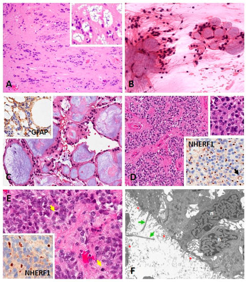 Morphology of subependymoma and ependymoma. (A) Subependymoma composed of clusters of isomorphic nuclei embedded in a fibrillary matrix of glial cell processes (HE, 100×). Cystic degeneration and nuclear pleomorphism (degeneration-related) can be present in larger tumors (inset) (HE, 200×). (B) Myxopapillary ependymoma showing ependymal cells with bland oval nuclei and fibrillary processes around aggregates of myxoid material (smear, HE, 200×). (C) Tissue section of myxopapillary ependymoma showing bland GFAP positive (inset, GFAP, 200×) ependymal cells around blood vessels with myxoid degeneration (HE, 200×). (D) Ependymoma composed of neoplastic glial cells arranged around blood vessels in pseudorosettes (HE, 100×). The tumor nuclei are round to oval, monomorphic with stippled chromatin (top inset) (HE, 200×). Anti-NHERF1/EBP50 immunohistochemistry showing numerous dot-like microlumens and a rare ring-like structure (arrow) (bottom inset) (200×). (E) Anaplastic ependymoma with enlarged pleomorphic nuclei and mitotic activity (arrows) (HE, 200×). Anti-NHERF1/EBP50 immunohistochemistry showing an area with microlumens (inset) (200×). (F) Electron micrograph showing the lumen of a true rosette lined by ependymal tumor cells with rare cilia (green arrows) and abundant microvilli (red asterisks) (18,000×). Abbreviations: HE—hematoxylin and eosin, n—nucleus Note: Photographs in D-F were kindly provided by Dr. Maria-Magdalena Georgescu, NeuroMarkers PLLC, Houston, TX, USA.