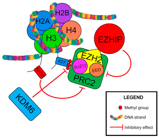 Mechanism of tumorigenesis in posterior fossa ependymoma Group A (PFA). EED—embryonic ectoderm development, EZH2—enhancer of zeste homolog 2, EZHIP—EZH inhibitory protein or Cxorf67, H2A—histone 2A, H2B—histone 2B, H3—histone 3, H4—histone 4, K27—lysine 27 on histone H3, K27M—methionine substitution for lysine on histone 3, KDM6—lysine-specific demethylase 6, PRC2—polycomb repressive complex 2, SUZ12—suppressor of zeste 12 homolog.