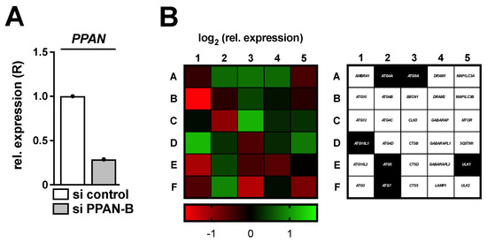 Knockdown of PPAN results in transcriptional alterations of autophagy related genes. HeLa cells were transfected with si PPAN-B for 48 h and subsequently analyzed by qRT-PCR. (A) Relative expression (R) of PPAN normalized to GAPDH is depicted. (B) The cDNA samples of (A) were subjected to a predesigned PrimePCRTM Autophagy panel (BioRad) and the respective genes were normalized to ACTB, GAPDH, HPRT1 as well as TBP (compare Figure S4). (Left) The normalized log2 relative expression upon PPAN knockdown in comparison to control transfected cells is depicted as a heatmap, (right) whereas right next to it the investigated genes are denoted. Thereby, the highlighted genes in black reflect targets, which were subsequently investigated.