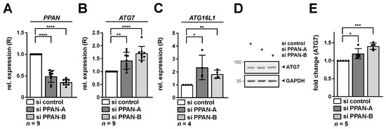 Depletion of PPAN leads to elevated amounts of ATG7 and ATG16L1 on mRNA and ATG7 on protein level. HeLa cells were transfected with PPAN siRNAs for 48 h as indicated and subsequently analyzed by qRT-PCR (A–C) and Western blotting (D,E). (A–C) The relative expression (R) of PPAN (A), ATG7 (B) and ATG16L1 (C) normalized to GAPDH is depicted. (D,E) RIPA whole cell lysates were subjected to Western blotting. Membranes were incubated with ATG7 and GAPDH antibodies. (E) Quantification of ATG7 normalized to GAPDH by densitometry as shown in (D). The si control was set to 1. Error bars represent S.D., p values were calculated by t-test. *, p < 0.05, **, p < 0.01, ***, p < 0.001, ****, p < 0.0001. n = number of independent experiments. The raw Western Blot can be found in Figure S5.