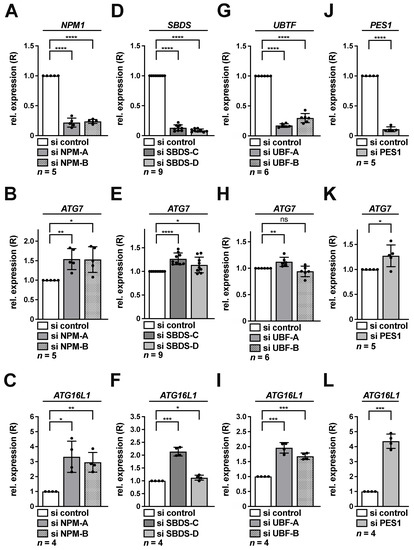 Knockdown of NPM, SBDS, UBF-1 or PES1 activates transcription of ATG7 and ATG16L1 in HeLa cells. HeLa cells were transfected with NPM (A–C), SBDS (D–F), UBF (G–I) or PES1 (J–L) si RNAs for 48 h as indicated and subsequently analyzed by qRT-PCR. Relative expression (R) of NPM1 (A), SBDS (D), UBTF (G), PES1 (J), ATG7 (B,E,H,K) or ATG16L1 (C,F,I,L) normalized to GAPDH is shown. The si control was set to 1. Error bars represent S.D., p values were calculated by t-test. *, p < 0.05, **, p < 0.01, ***, p < 0.001, ****, p < 0.0001, ns, non-significant. n = number of independent experiments.