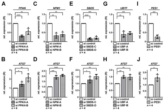 Knockdown of PPAN, NPM, SBDS, UBF-1 or PES1 activates transcription of ATG7 in U2OS cells. U2OS cells were transfected with PPAN (A,B), NPM (C,D), SBDS (E,F), UBF (G,H) or PES1 (I,J) si RNAs for 48 h as indicated and subsequently analyzed by qRT-PCR. Relative expression (R) of PPAN (A), NPM1 (C), SBDS (E), UBTF (G), PES1 (I) or ATG7 (B,D,F,H,J) normalized to GAPDH is shown. The si control was set to 1. Error bars represent S.D., p values were calculated by t-test. *, p < 0.05, **, p < 0.01, ***, p < 0.001, ****, p < 0.0001. n = number of independent experiments.
