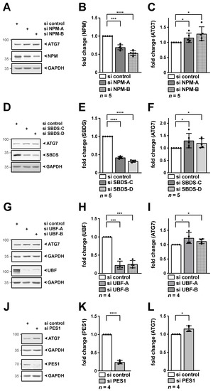 Knockdown of NPM, SBDS, UBF-1 or PES1 results in increased ATG7 protein levels. HeLa cells were transfected with the indicated si RNAs for 48 h. RIPA whole cell lysates were subjected to Western blotting, membranes were probed with NPM (A), SBDS (D), UBF (G), PES1 (J) as well as ATG7 and GAPDH antibodies as indicated. (A–C) Knockdown of NPM increases ATG7. Quantification of NPM (B) and ATG7 (C) normalized to GAPDH as shown in (A). (D–F) Knockdown of SBDS increases ATG7. Quantification of SBDS (E) and ATG7 (F) normalized to GAPDH as shown in (D). (G–I) Knockdown of UBF-1 increases ATG7. Quantification of UBF (H) and ATG7 (I) normalized to GAPDH as shown in (G). (J–L) Knockdown of PES1 increases ATG7. Quantification of PES1 (K) and ATG7 (L) normalized to GAPDH as shown in (J). Representative Western blots are shown, numbers indicate kDa. The si control was set to 1. Error bars represent S.D., p values were calculated by t-test. *, p < 0.05, ***, p < 0.001, ****, p < 0.0001. n = number of independent experiments. The raw Western Blots can be found in Figures S7–S9.