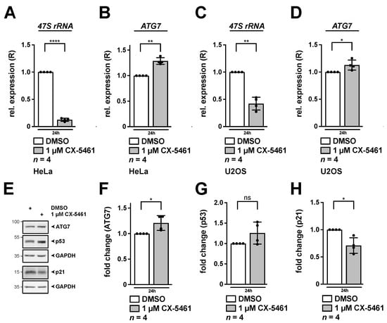Inhibition of RNA pol I by CX-5461 leads to increased expression of ATG7. HeLa (A,B,E–H) or U2OS cells (C,D) were incubated with 1 µM CX-5461 for 24 h. (A–D) Relative expression (R) of 47S rRNA (A,C) and ATG7 (B,D) as determined by qRT-PCR normalized to GAPDH is shown. (E–H) RIPA whole cell lysates were subjected to Western blotting and membranes were incubated with ATG7, p53, p21 and GAPDH antibodies as indicated. Quantification of ATG7 (F), p53 (G) and p21 (H) normalized to GAPDH as shown in (E). DMSO treated cells served as control and were set to 1. Error bars represent S.D., p values were calculated by t-test. *, p < 0.05, **, p < 0.01, ****, p < 0.0001, ns, non-significant. n = number of independent experiments. The raw Western Blots can be found in Figure S10.