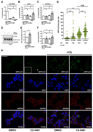 Given the increase of ATG7 and other autophagy factors exposed to nucleolar stress, we determined autophagic flux in response to CX-5461. Of note, CX-5461 has earlier been connected to activation of autophagy [11,24,32,45], however, flux studies have not been performed in detail, at least to our knowledge. We used well-established, stable HEK293A GFP-LC3 cells, which reflect a common model to monitor accumulation of GFP-positive autophagosomes and the state of lipidation of LC3 as readout for autophagy activation [30,40]. As a basis for our studies, we first verified functionality of CX-5461 in the cells by decrease in 47S rRNA in presence and absence of the autophagy inhibitor chloroquine (CQ) (Figure 7A). Interestingly, we noticed that CQ treatment per se led to a decrease in 47S rRNA. We also measured levels of ATG7 (Figure 7B) and ATG16L1 (Figure 7C) under these conditions. Whereas expression was not increased upon CX-5461 treatment in absence of CQ, we noticed a significant increase in response to CQ for all targets. The same was true for further autophagy factors ATG5, ATG9A and ULK1, with exception that ATG4 was already induced in absence of CQ (Figure S3). Importantly, protein levels of lipidated GFP tagged LC3-II were significantly increased in flux assays with CQ in response to CX-5461 (Figure 7D,E) and correlated with increased ATG7 protein levels (Figure 7D,F), thereby suggesting activation of autophagic activity.