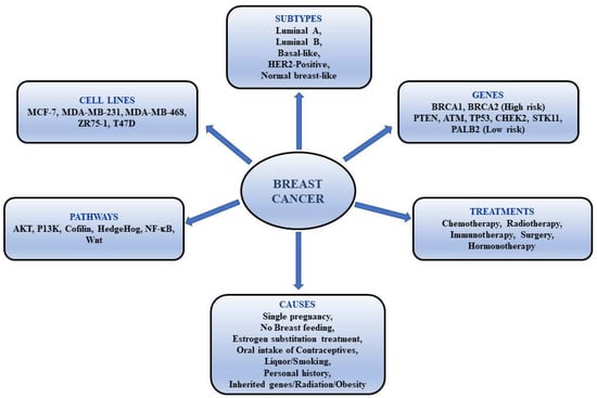 European Code Against Cancer reported that about 9% of breast cancer is caused due to lack of physical activity [14]. The European Journal of Oncology Nursing reported that around three hours of exercise per week reduced the risk of patients suffering from breast cancer. Therefore, the risk of breast cancer can be reduced with routine exercise. Reducing body fat, especially after menopause, can also decrease the risk. Therapeutic approaches for breast cancer consist of surgery, hospitalization, radiation therapy, chemotherapy, and hormone therapy. On the other hand, bioactive compounds from plant source can be combined with chemotherapeutic drugs to minimize the side effects. Breast cancer types, genes involved, causes, and cell lines are illustrated in Figure 1.
