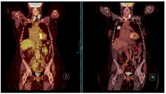 Patient 5 underwent resection of a cervical FTC recurrence diagnosed 5 years after thyroidectomy despite bilateral lung metastases (18F-FDG PET on the left side (A)). Cervical and thorax EBRT were performed. The 18F-FDG PET on the right (B) (5 years after the second cervical resection and 10 years after first FTC diagnosis) shows both cervical and lung progress. After thorough patient information concerning the evidence on tyrosine kinase inhibitors, the patient refused treatment and was progressing at last follow-up.
