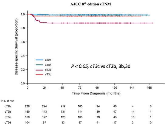 Patients with IIRC Group E eyes had worse survival than those with Group D eyes (5-year DSS of 93.7% vs. 99.1%; p < 0.001) (Table 2). According to AJCC cTNM 8th edition [22], patients with cT3c had 5-year DSS of 87.1%, significantly worse than those with cT2b (99.1%), cT3b (98.7%), or cT3d (97.2%) (p < 0.05) (Table 2, Figure 1).