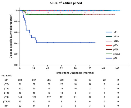 Kaplan–Meier curves of disease-specific survival (DSS) of patients treated with primary enucleation classified by AJCC 8th edition pTNM.