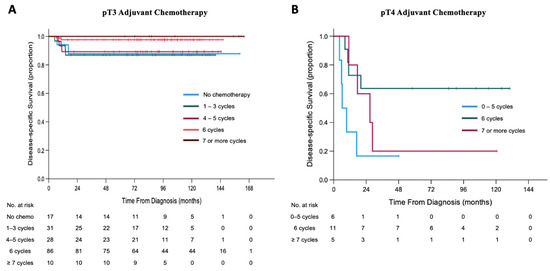 Kaplan–Meier curves of disease-specific survival (DSS) of patients treated with different cycles of adjuvant chemotherapy for AJCC 8th edition. (A) pT3 pathology. (B) pT4 pathology.