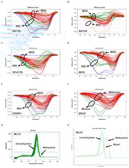 Use of the N_LyST panel to screen for Lynch syndrome. Differential plots are shown for 5 microsatellite markers BAT25 (A), BAT26 (B), BCAT25 (C), MYB (D), and EWSR1 (E). The differential melt curves of the tumours with microsatellite instability (MSI) and those that are microsatellite stable (MSS) are indicated by the distinct black circles. The differential melt curves of the tumours with wild-type BRAF are different from those with mutant BRAF, as indicated by respective black circles (F). Derivative plots are shown for the CpG Island region C of MLH1 for tumour samples (G) and human DNA control (H). For tumour samples, two discrete melting forms are shown: ‘methylated’, comprising two melting peaks that represent methylated DNA (from tumour epithelium) and non-methylated DNA (from tumour stroma) or ‘non-methylated’, comprising one melting peak that characterises a completely non-methylated tumour and stroma cell population.