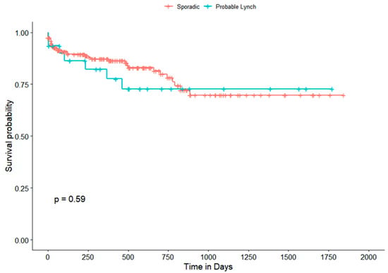 Overall survival curves for CRC patients in “Probable Lynch” and sporadic groups. Survival was evaluated using Kaplan–Meier curves and compared with the log-rank test.
