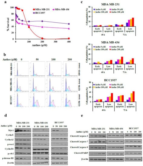 The effect of Anthos on cell-cycle progression was assessed through flow cytometry by PI staining of TNBC cells after treatment with Anthos in a dose- and time-dependent manner. Our results indicated significant G0/G1 arrest in MDA-MB-231 cells, and G2/M arrest in MDA-MB-436 and HCC1937 cells (Figure 1b and Figure S4). These observations also occurred dose-dependently, with modulation of several key cell-cycle regulatory kinases and protein targets after Anthos treatment, including Cyclin A, Cyclin B1, Cyclin E2, p-CDC2, p-wee1, p-histone H2, and Myt1 (Figure 1c).