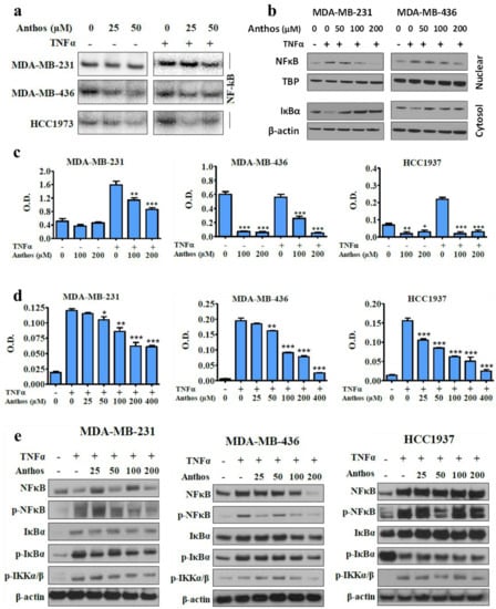 We investigated the ability of the Anthos to inhibit constitutive and TNFα-induced NF-κB activation and NF-κB binding activity by gel mobility shift assay (EMSA). In MDA-MB-436 and HCC1937 cells, Anthos at 50 µM diminished both constitutive and TNFα-induced NF-κB activation, indicating anti-inflammatory activity. However, such inhibition in MDA-MB-231 cells was much less effective (Figure 2a). Further examination of NF-κB binding activity by ELISA in the presence of Anthos indicated effective inhibition of TNFα-induced NF-κB binding activity in all TNBC cell lines tested. While Anthos inhibited uninduced NF-κB binding activity in MDA-MB-436 and HCC1937, it did not affect MDA-MB-231 cells (Figure 2b). These observations were in agreement with our EMSA assay findings.