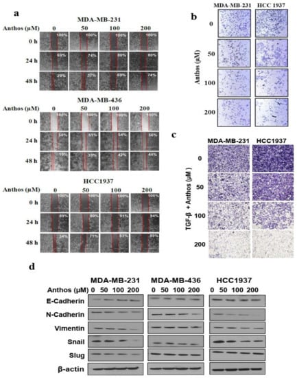 The effect of Anthos on the metastasis of TNBC cells in vitro was assessed through wound-healing and trans-well migration and invasion studies. Anthos at 100 and 200 µM resulted in greater abrogation of metastatic potential of MDA-MB-231 and HCC1937 cells up to 48 h (Figure 3d), while MDA-MB-436 cell migration ability was the least affected by Anthos (Figure 3a). MDA-MB-231 and MDA-MB-436 cells were the most aggressive among the TNBC cell lines tested. Anthos treatment was less effective in inhibiting the migration ability of MDA-MB-436 cells, compared to MDA-MB-231 cells. Further, the effect of Anthos on the invasive behavior of TNBC cells was tested using Matrigel trans-well migration and invasion assay. Our results indicated that Anthos could effectively inhibit both native (Figure 3b) and TGFβ -induced invasiveness of MDA-MB-231 and HCC1973 (Figure 3b).