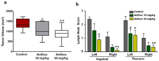Effect of Anthos on tumor growth inhibition and lymph node metastasis: (a) NOD-Scid mice were inoculated (Ventral right, under second inguinal nipple) with MDA-MB-231 BC cells (2.5 × 106 cells) to produce an orthotopic tumor. When the tumor grew to ~120 mm3, animals were treated (oral gavage, three times a week) with Anthos (30 mg/kg or 60 mg/kg b.wt.). Control groups received PBS; (b) At euthanasia, lymph nodes were scored for size (as 0, 1+, 2+, or 3+). Data represent average ± SE (n = 9–10). Data represent average ± SE (n = 9–10). Statistical analysis was carried out using student’s t-test; * p < 0.05; ** p < 0.005.