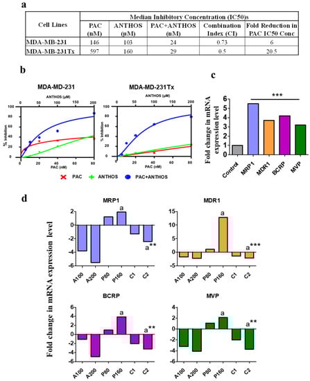 After establishing the anti-cancer effects of Anthos against MDA-MB-231 cells and tumors, we sought to investigate whether Anthos had an inhibitory effect on PAC-resistant MDA-MB-231 (MDA-MB-231Tx) cells. The effect of the Anthos alone and in combination with PAC on the cell growth inhibition of parental MDA-MB-231 and PAC-resistant MDA-MB-231Tx cells was determined by MTT assay. Our findings indicated significant inhibition of cell proliferation of MDA-MB-231Tx cells (Figure 5a), and that the IC50 values of Anthos and PAC alone were 160 µM and 597 nM, respectively; however, the IC50 value of PAC was substantially reduced (29 nM) when PAC was combined with Anthos. Thus, Anthos–PAC combined treatment resulted in a near 20-fold lowering of the IC50 of PAC (Figure 5a).