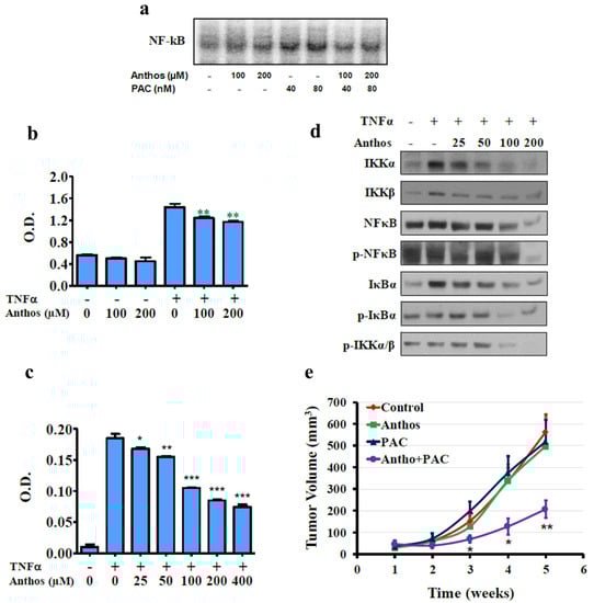 Effect of Anthos on NF-κB activation, NF-κB pathway proteins, and tumor growth inhibition of PAC-resistant BC cells: (a) MDA-MB-231Tx cells were treated with Anthos and PAC, alone and in combination, for 48 h and nuclear extracts were analyzed by EMSA; (b) BC cells were treated with Anthos (100 and 200 μM) in presence or absence of TNF-α for 48 h and nuclear extracts were analyzed by ELISA; (c) Whole-cell lysates were prepared and immune-precipitated with anti-IKKβ antibody. The immuno-complex kinase assay was performed by ELISA using CycLex® IKKα and β Kinase Assay/Inhibitor Screening Kit; (d) BC cells were treated with Anthos (0–200 μM) for 48 h. Whole-cell lysates were probed for IκBα and P65 levels. Equal loading confirmed by β-actin; (e) Effect of Anthos on MDA-MB-231Tx tumor growth inhibition. NOD-Scid mice were inoculated with MDA-MB-231Tx BC cells (2.5 × 106 cells) under the nipple to produce orthotopic tumors. When tumor xenografts grew to ~120 mm3, animals were treated with Anthos (60 mg/kg b. wt.; 3 times/week; oral gavage), PAC (4 mg/kg, b. wt; once weekly; i.p.), or both. Control groups were treated with PBS. Data represent average ± SE (n = 10). Statistical analysis was c using student’s t-test; * p < 0.05; ** p < 0.01, *** p < 0.001. Densitometry data from panels A and D are presented in Figure S12.