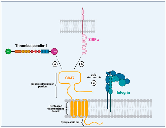 Illustration of the CD47 structure (in yellow) showing its single immunoglobulin (Ig)-like domain that interacts with thrombospondin-1 (TSP-1; (a), SIRPα (b), and integrins (c). It also depicts CD47 multispan transmembrane domain and its intracytoplasmic tail. Created with Biorender.Com.