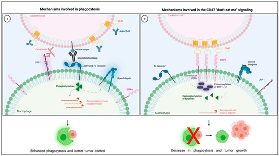 Illustration showing the mechanisms involved in the CD47 blockade and pro-phagocytic signals leading to phagocytosis (a) together with the mechanisms involved in the CD47 “don’t eat me signaling” through its interaction with SIRPα in the phagocytic synapse (b). Created with Biorender.com.