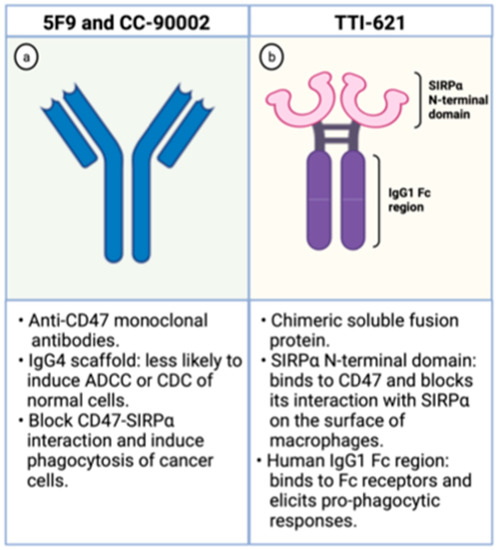 Schematic representation of CD47 blocking agents. On the left (a), schematic representation of anti-CD47 monoclonal antibodies. On the right (b), schematic representation of TTI-621, a chimeric fusion protein composed by the SIRPα binding domain and the human IgG1 Fc region. Created with Biorender.com.